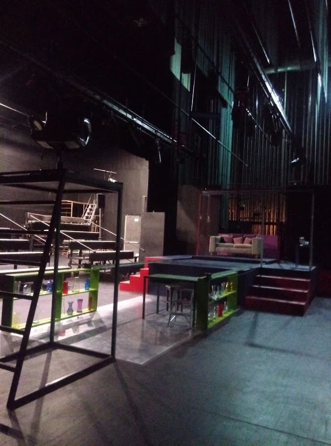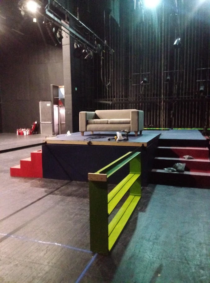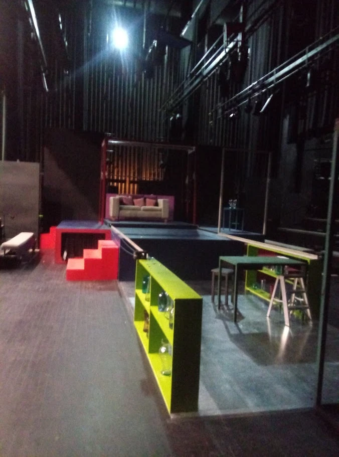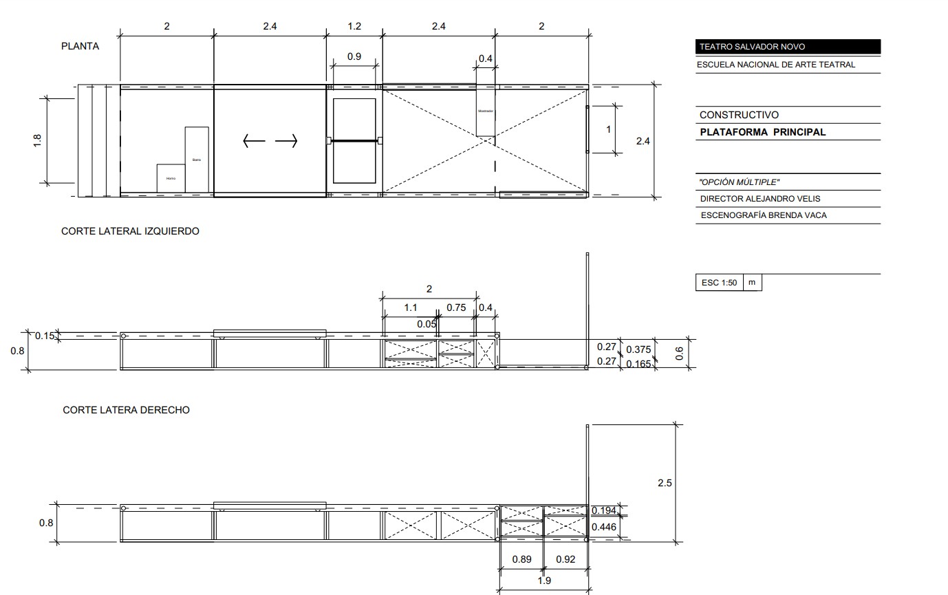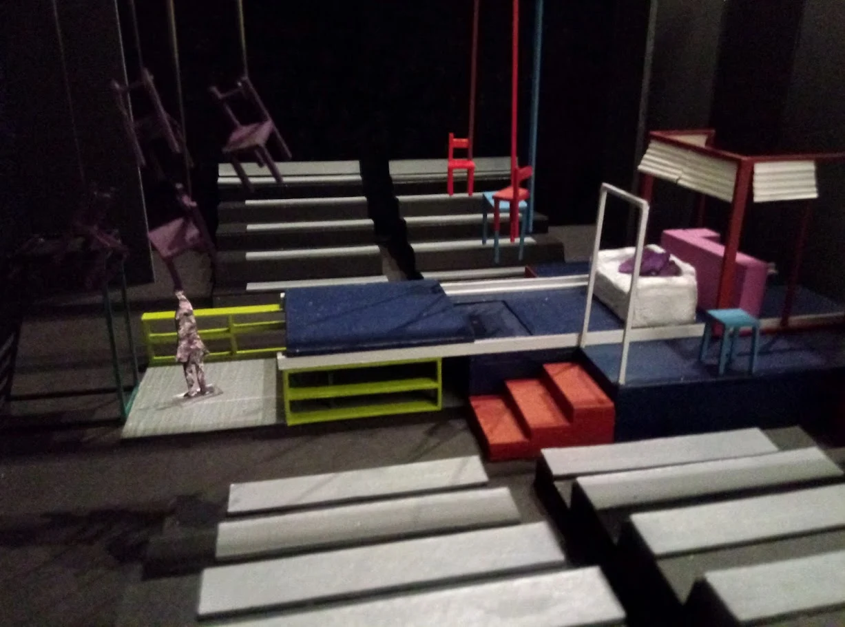 Para el último montaje del año se realizó un taller a base del texto para explorar el espacio. Diseñe, construí y pinté la escenografía. Era una plataforma que se deslizaba sobre otra para crear los diferentes espacios a los que iba la(s) protagonistas. Durante este proceso fue que aprendí los diferentes pasos a seguir de un montaje desde ensayar hasta desmontar y almacenar una escenografía.