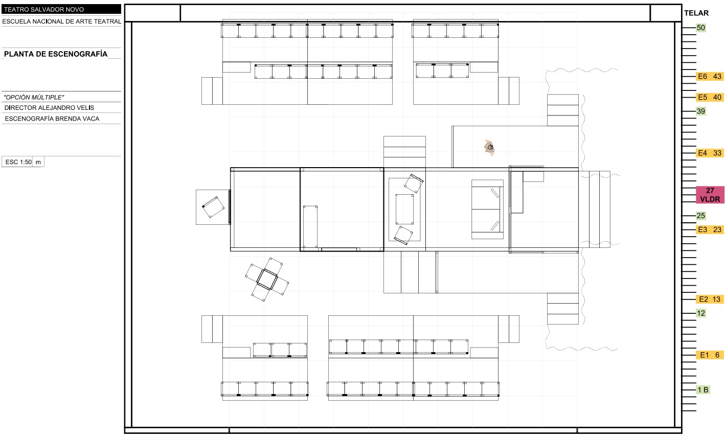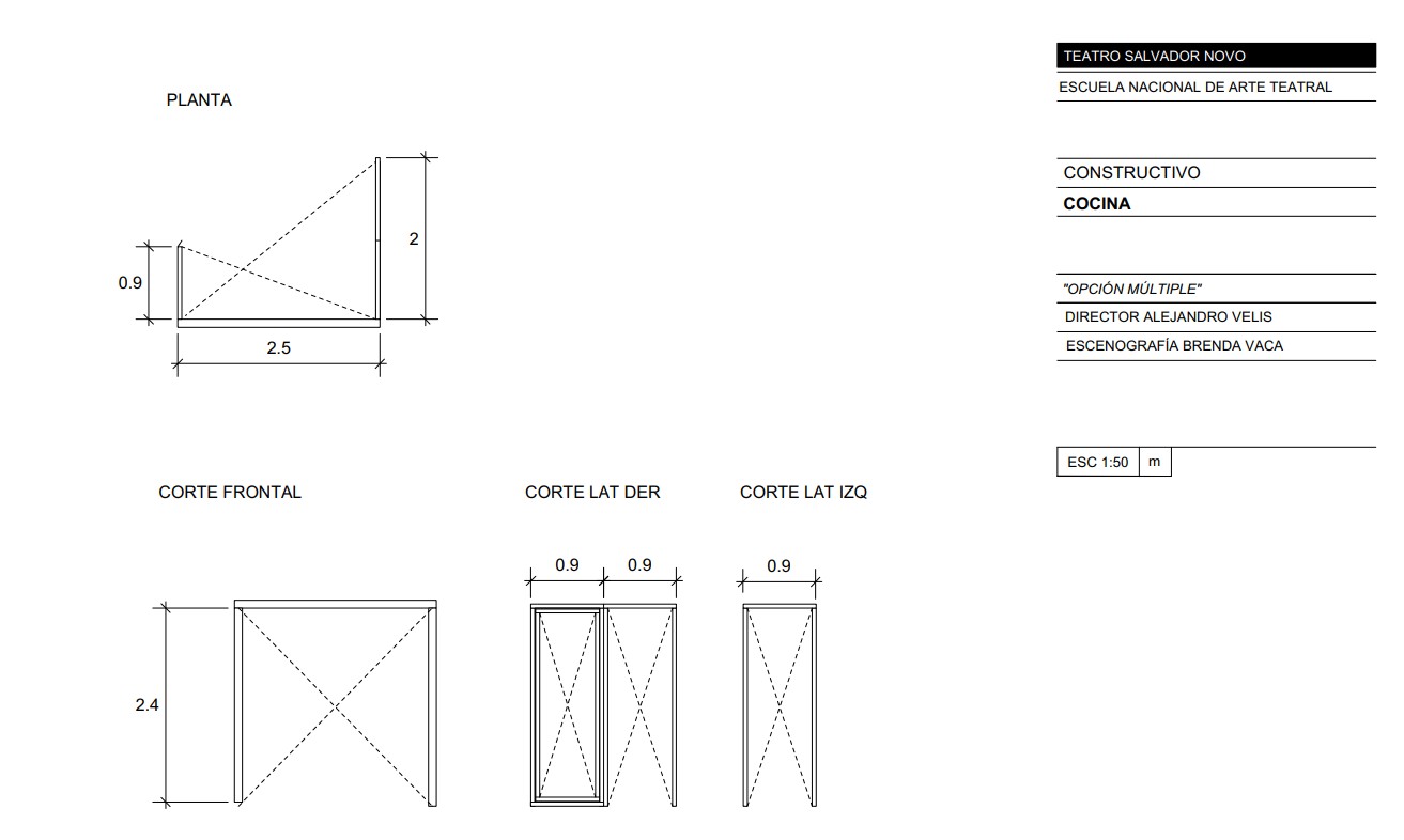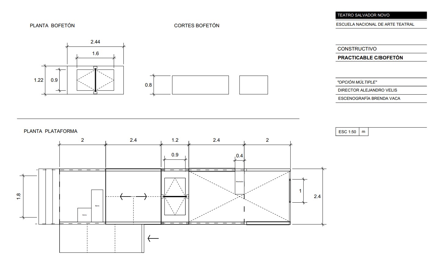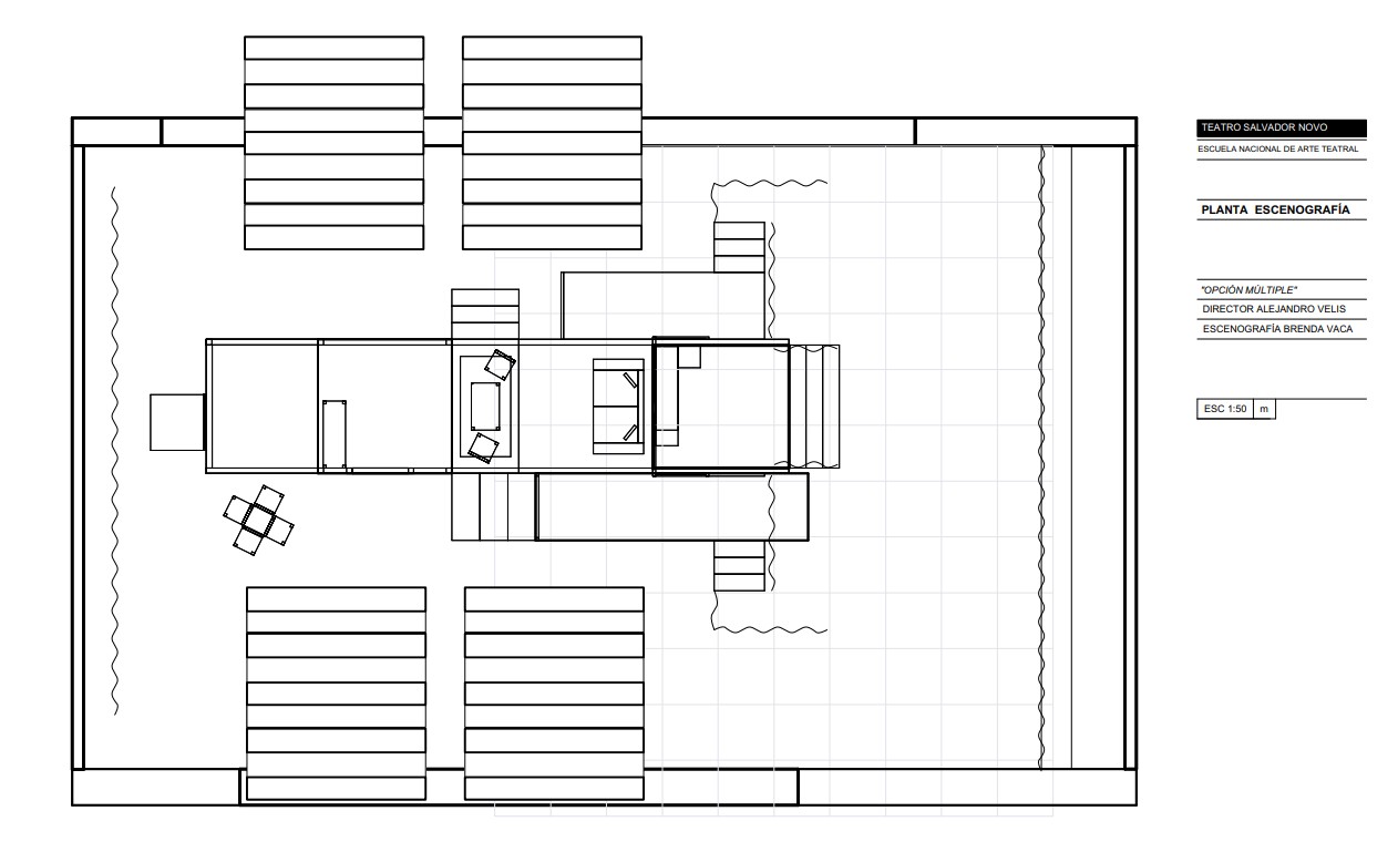 Para el último montaje del año se realizó un taller a base del texto para explorar el espacio. Diseñe, construí y pinté la escenografía. Era una plataforma que se deslizaba sobre otra para crear los diferentes espacios a los que iba la(s) protagonistas. Durante este proceso fue que aprendí los diferentes pasos a seguir de un montaje desde ensayar hasta desmontar y almacenar una escenografía.